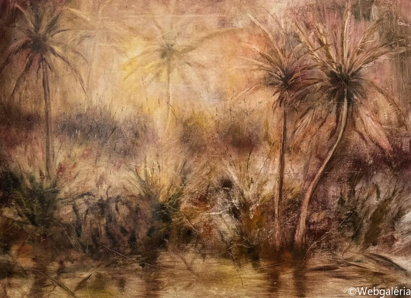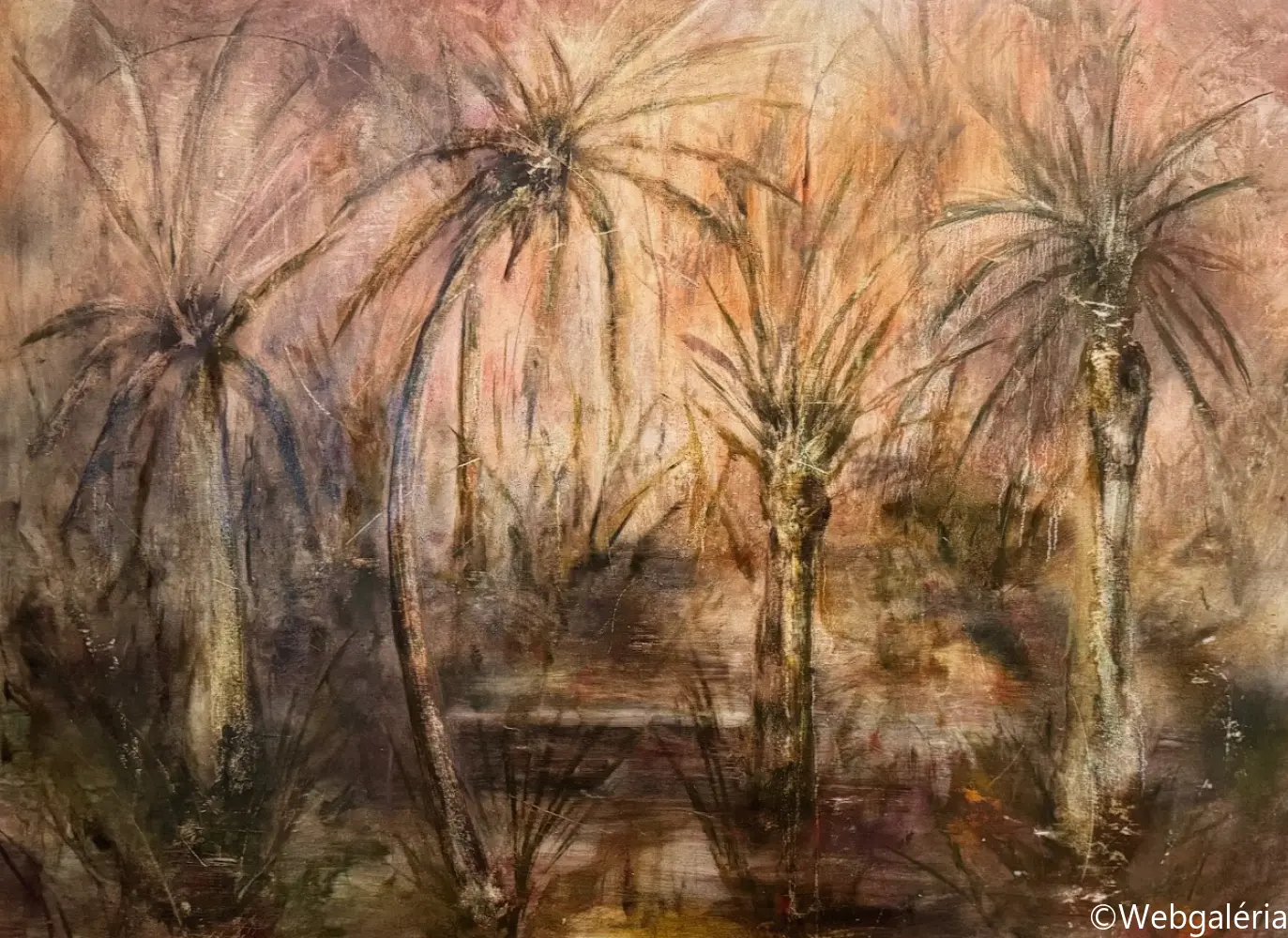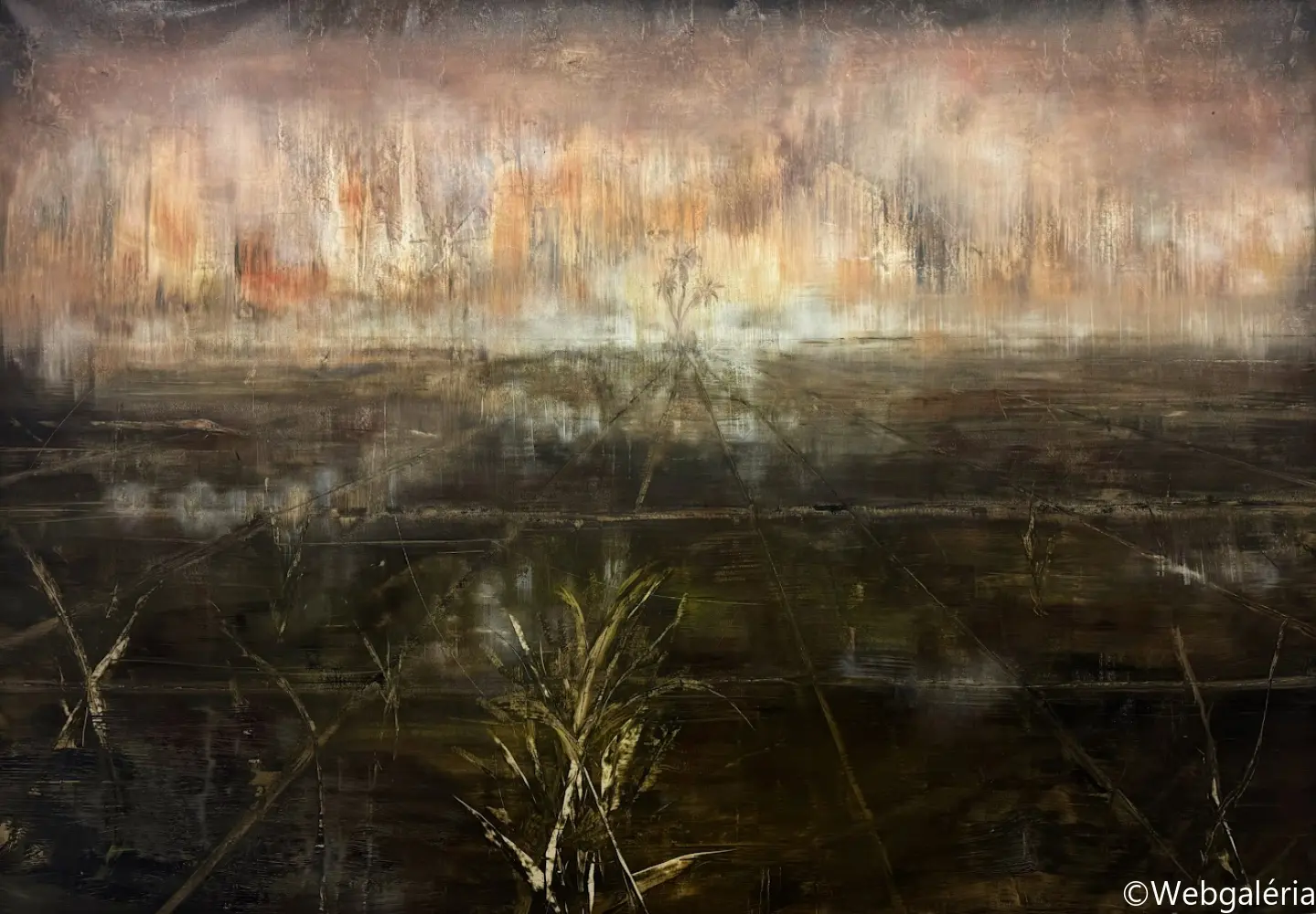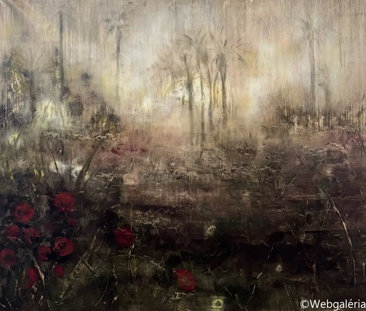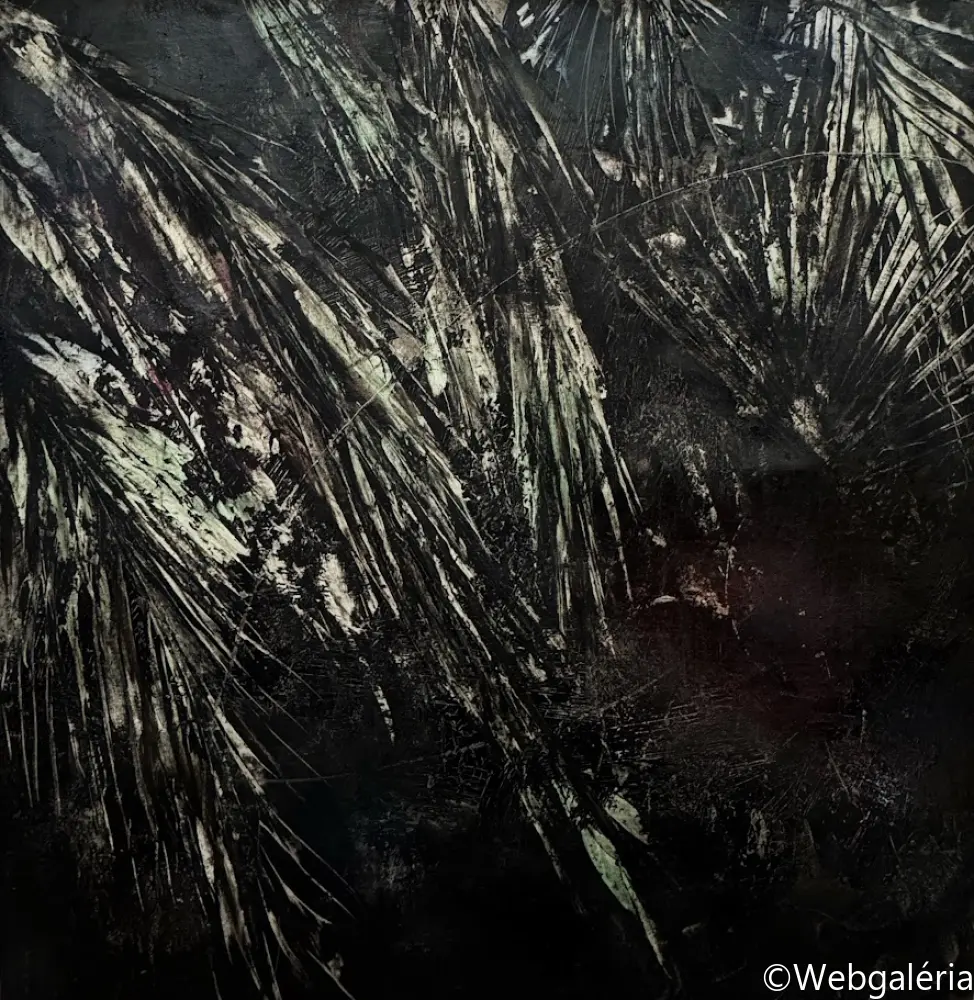 Festészeti munkáim középpontjában a táj mint mentális konstrukció áll. Nem a természet ábrázolása érdekel, hanem azok a belső terek, amelyek az emlékezet, a vágy, a hiány és a bizonytalanság rétegeiből épülnek fel. A képeimen megjelenő tájak nem topografikus helyek, hanem instabil, határ nélküli mezők, ahol a természeti formák-fák, növényi struktúrák, horizontok elveszítik eredeti funkciójukat, és pszichikus jelekké alakulnak. A kert, majd később az út és végül a Tartarosz fogalma mentén egy olyan belső táj bontakozik ki, amely egyszerre hordozza a menedék és a bomlás tapasztalatát. Ezekben a terekben a rom, a nem-hely és a senkiföldje nem pusztán motívumok, hanem szervezőelvek: az átmenetiség, a sodródás és az identitás feloldódásának vizuális formái. A gyakran visszatérő pálmafa-motívum a trópusi idill kollektív képzetét idézi meg, ironikusan elmozdítva azt a hamis ígéretek és az elérhetetlen vágy tere felé. Festészeti technikám a kontroll és a véletlen közötti feszültségre épül. Referenciák nélkül dolgozom, a képek anyagi folyamataiból indulva: lazúros rétegek, törlések, csorgatások, kaparások és oldódások alakítják a felületet. A festmény nem előre elgondolt kompozícióként születik meg, hanem az anyag reakcióin keresztül formálódik, mintegy önmagát építve fel. A felület így nem ábrázol, hanem eseményt rögzít – a széthullás és az újraszerveződés folyamatos állapotát. Munkáimban a sötétség, a bizonytalanság és a lebegés nem negatív tartományok, hanem a jelentésképzés lehetőségei. A képek egy belső alvilág felszíneiként működnek, ahol a romlás nem végpont, hanem a teremtés előfeltétele. Ez a tér számomra az alvilág romantikája: annak elfogadása, hogy a létezés nem stabil formákban, hanem folyamatos átváltozásban ragadható meg.