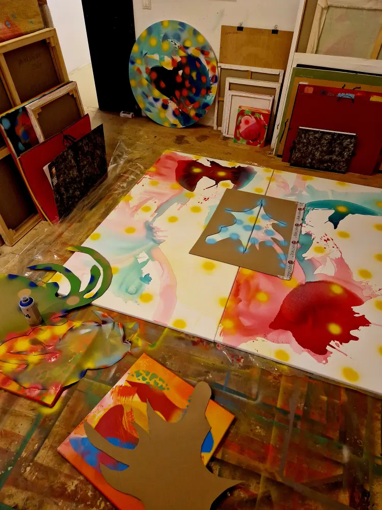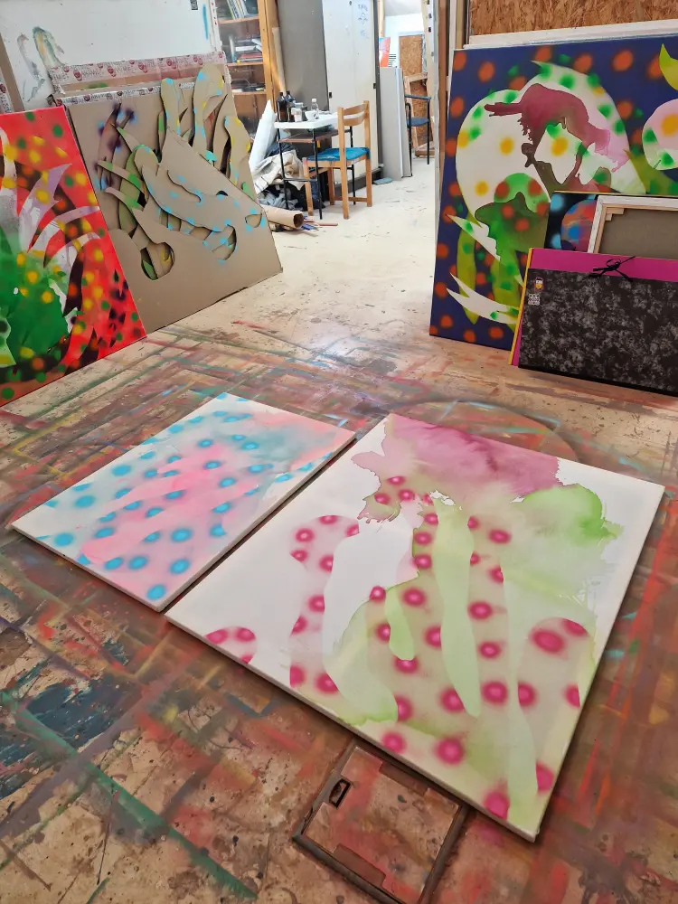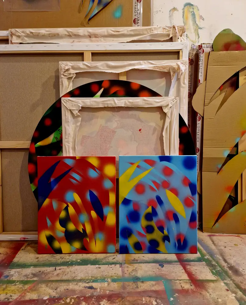 Festészeti munkámban túlnyomó többségben sorozatokban gondolkozom. Az egyes sorozatok sokszor 10-30 vagy akár 40 munkából állnak, amiket ugyanarra a tematikára építek fel és a különféle megfogalmazási/formázási módokkal kísérletezem az individuális vásznakon. Mondhatjuk, hogy a festészetem a variációk egy témára fantázianevet is viselhetné. Anyag használatomban preferálom az akrilfestéket és a festék sprayt, amikkel izgalmas és vibráló felületeket tudok létrehozni. A munkámat jellemzi a kísérletezés és a színekkel való játék valamint a finom rétegek felépítése és formák létrehozása kézzel készített stencilek segítségével. Foglalkoztatnak az absztrakt gondolati és egzisztenciális sík különféle dimenziói, az alkotásaimban ezeknek a belső rétegeknek a kavargó, különös és szemi-transzparens világát igyekszem bemutatni. Hogyan ölt formát egy gondolat és érzés, hogyan lehet ilyen és ehhez hasonló elvont koncepciókat átültetni a fizikai valóság síkjára? Ezekre a kérdésekre próbálok választ találni a festészet segítségével. A rétegek sok helyütt átlátszóak, mintázottak, rálátást engednek az alattuk található rétegre, portál szerűek, ezzel erősítve rá ennek a nem materiális síknak a dinamikusságára. A jövőben mindenképp szeretnék nagy hangsúlyt fordítani a jelenlegi palettám bővítésére mind színbeli, mind formbabeli tekintetben, valamint tovább csiszolni a koncepcióim megvalósításához szükséges technikai képességeim.